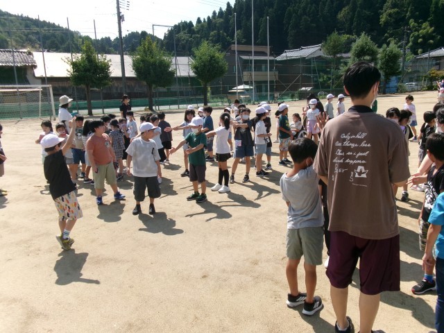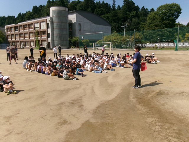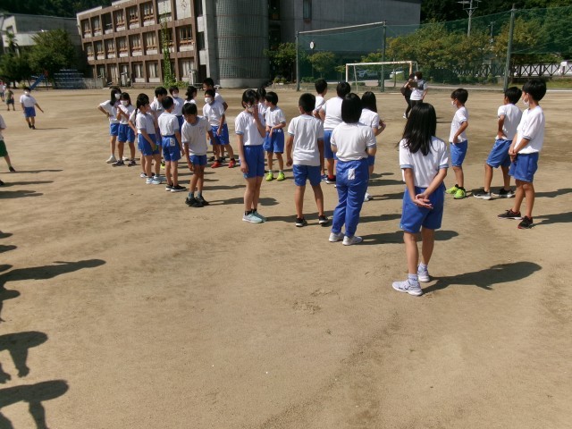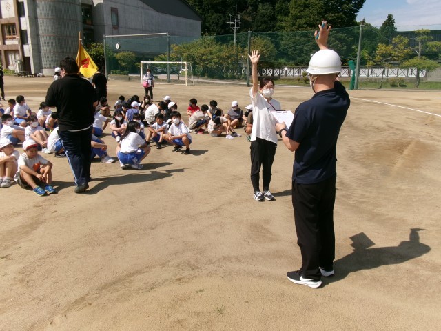 今回は「休み時間中」の火災を想定した避難訓練でした。子どもたちは、それぞれが違った場所で違うことをして過ごしています。そんな中、家庭科室で出火!。職員が駆けつけて初期消火をしますが、火の勢いは増すばかり。この危機を非常ベルと放送で全校に知らせます。子どもたちは一人一人が放送を聴いて判断し、より安全な経路を選択して避難しました。この放送を聴く時の姿勢、話の聞き方が良かったです。また、グラウンドの避難場所に集まった際も、子どもたち同士で声を掛け合い、自分たちで整列することができました。