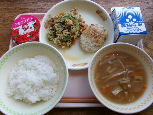 今日の献立は「ご飯」「豆腐ハンバーグ和風ソース」「ゴーヤチャンプルー」「切り干し大根の味噌汁」「アセロラゼリー」「牛乳」です。豆腐ハンバーグは柔らかくて、穏やかな塩味でとてもおいしかったです。ゴーヤチャンプルーはゴーヤの苦みがほとんどなく、豚肉と卵が絡み合ってご飯がすすみます。味噌汁は、切り干し大根、油揚げ、にんじん、高野豆腐がすべて千切りされていて、とても食べやすく食感も楽しかったです。アセロラゼリーがついたので、子どもたちは大事に食べたと思います。