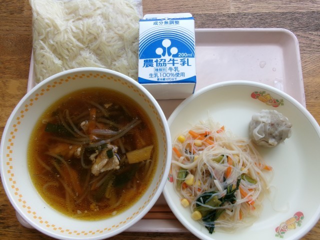 今日の献立は「ゆで中華めん」「醤油ラーメンスープ」「レンコンシューマイ」「小松菜と春雨の甘酢和え」「牛乳」です。醤油ラーメンは丁度良い塩味で、黄色い縮れめんによく絡み、もやしとニラ、チャーシューのような豚肉と一緒に食べるとさらにおいしく感じました。シューマイは具がぎっしりで、レンコンも柔らかかったです。甘酢和えは、春雨とにんじん、小松菜、千切りのかまぼこが甘酸っぱく和えてあり、丁度良い酸味でおいしかったです。