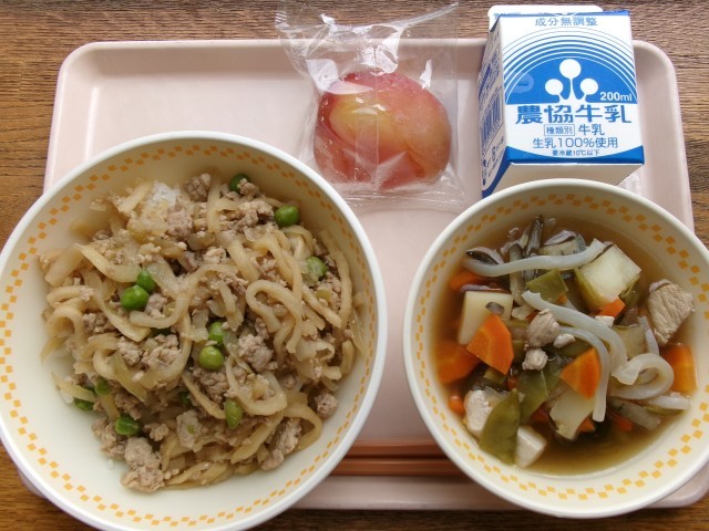 今日の献立は「ご飯」「しゃきしゃきそぼろ丼の具」「なすけんちん汁」「アップルシャーベット」「牛乳」です。そぼろ丼は、切り干し大根が柔らかく煮込まれていて、ひき肉とタマネギにおいしいスープが吸収され、グリーンピースの緑が鮮やかで、ご飯がすすみます。けんちん汁は具だくさんで、じゃがいもとこんにゃく、なす、豆腐、ごぼうの組み合わせがとても良く、スープにはごぼうと鶏肉の出汁が出て、すごくおいしかったです。今日も30℃を越える暑さなので、アップルシャーベットが体を冷やしてくれてとてもさわやかな気持ちになります。