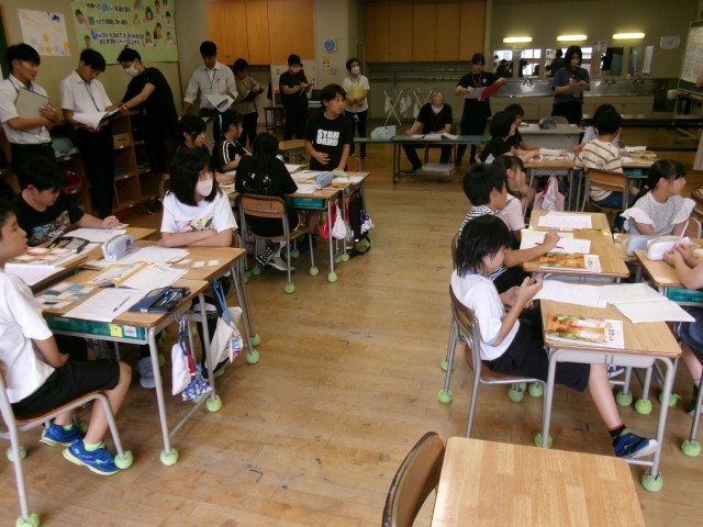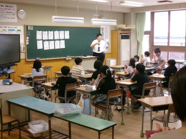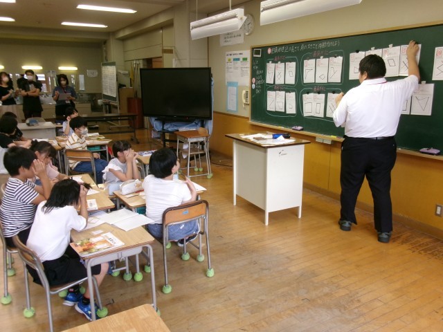 5時間目に4年生が算数の授業公開をしてくれました。初任者研修の一貫で加茂市や田上町の小学校に赴任した初任者の先生方も参観してくださいました。単元名は「これでみんなも名探偵!四角形の謎を解こう!(教材名:垂直、平行と四角形)」です。前時までに子どもたちに「ドット図」を配布し、点と点を好きなように結び、いろんな四角形を作ってもらっています。本時は、その四角形を2つの視点(辺の長さ、角の大きさ)で、どんなふうに仲間分けできるか考えるのが学習課題◎でした。子どもたちは真剣に話を聞き、グループになって、視点に合わせて仲間分けし、そのグループに名前を付けて発表していました。いろんな仲間分けができるのですが、後々、新たに学ぶ「垂直」と「平行」という観点から仲間分けするとどうなるか、その仲間分けした四角形には特別な名前が付いていることを学んでいくことになります。数あるものから共通点を探して分類する力を身に付けつつある4年生でした。
