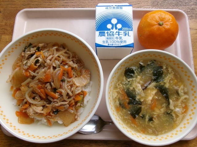 今日の献立は「ご飯」「豚キムチ丼の具」「玉子入り中華風コーンスープ」「冷凍ミカン」「牛乳」です。豚キムチ丼は、キムチの赤唐辛子が目に付きますが、それほど辛くありません。豚肉、白菜、にんじん、玉ねぎ、もやしがすべて一口大より小さくカットされ、子どもたちがモリモリ食べても喉を詰まらせないように配慮されているなと思いました。コーンスープは、ふわっとした玉子が、ベーコンとわかめ、玉ねぎとしいたけを包み込んで丁度いい塩味でおいしかったです。子どもたちはおかわり必至だと思います。冷凍ミカンは、ほどよく溶けていて、ミカンがシャリシャリしておいしかったです。「先生、手を洗ってきていいですか」と尋ねる子どもたちの姿が目に浮かびます。