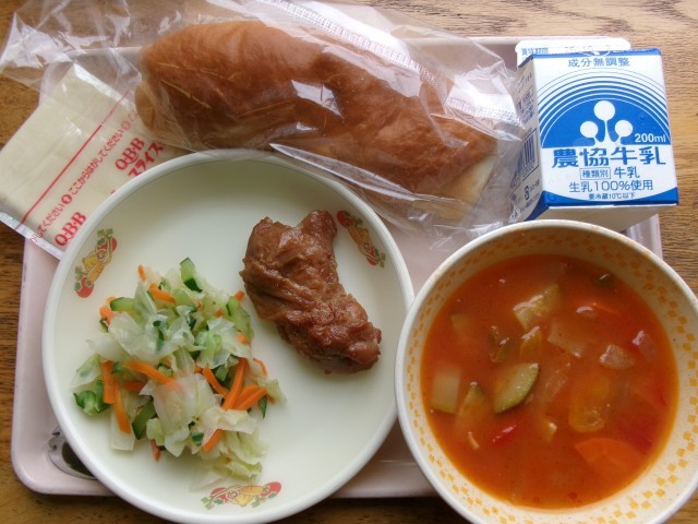 今日の献立は「米粉パン」「鶏の照り焼き」「添え野菜」「ラタトゥユスープ」「スライスチーズ」「牛乳」です。米粉入りのコッペパンで食感がもちもちしておいしかったです。それを手作りで半分に裂き、スライスチーズと添え野菜(キャベツ、きゅうり、にんじん)と柔らかくて甘辛い鶏の照り焼きをはさみ、ホットドッグのようにしておいしくいただきました。スープは、玉ねぎ、ズッキーニ、パプリカ、ニンニクをオリーブオイルで炒め、彩りがとてもよく、トマトベースでおいしく仕上がっています。いろんな野菜を食べるいい食の経験ができたと思います。