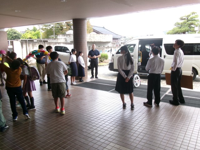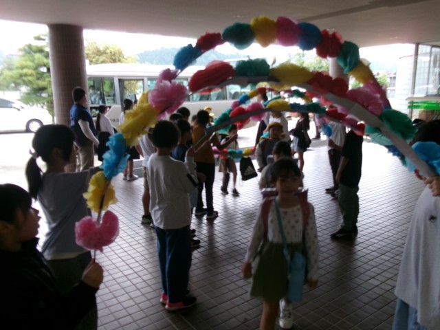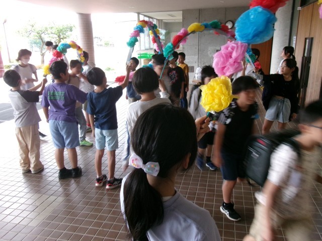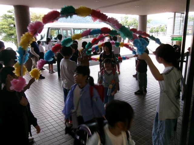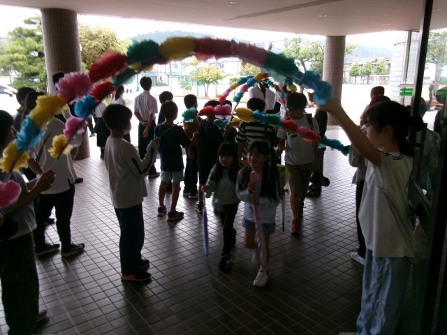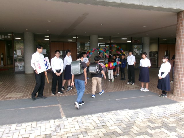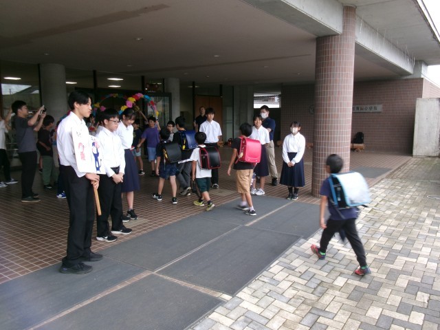 小中連携の「あいさつ運動」2日目です。子どもたちは、昨日は、大きな中学生の姿を見て、ちょっとひるむ子もいました。また、5年生のあいさつアーチをくぐり抜けるのを恥ずかしがって、避けて通ろうとする子もいました。でも今日は、これらに慣れて、みんな大きな声であいさつすることができました。中学生のみなさん、5年生の子どもたちに「素晴らしい企画をありがとう」と感謝したいです。