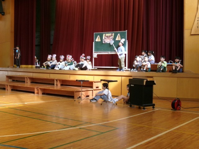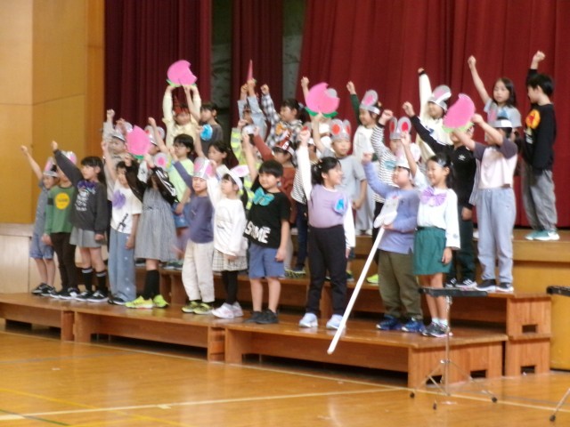 時には動画を撮影し、それを見返しながら「台詞や動作、歌や合奏、ダンス、表情、笑顔」について意見を出し合い、改善に改善を重ねてきました。画像は5年生と2年生です。ご覧ください。