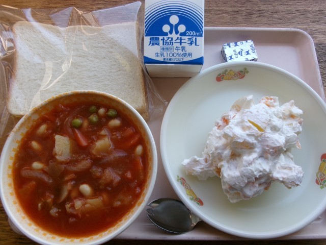 今日の献立は「食パン」「フルーツクリーム和え」「ポークビーンズ」「角チーズ」「牛乳」です。フルーツクリームを食パンに挟んで、いわゆる「フルーツサンド」にしていただきます。これを楽しみにしている子どもたちがたくさんいます。クリームの甘さが絶妙で、さっぱりした甘さです。そこにバナナや桃、りんごの自然の甘さが加わってとてもおいしいです。無限に食べられそうです。ポークビーンズはトマトベースのスープに玉ねぎ、じゃがいも、にんじん、豆、豚肉、ベーコン、マッシュルーム、セロリが入っています。トマト味がしみ込んだ玉ねぎと大きくてホクホクしたじゃがいもがとてもおいしいです。しょうがとにんにくも入っているのでかぜ予防にもいいですし、パワーとスタミナもつきますね。