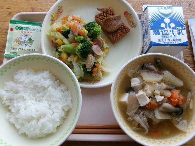 今日の献立は「ご飯」「いかのピリ辛煮」「ブロッコリーのソテー」「豚汁」「ふりかけ」「牛乳」です。いかはタレがよくしみ込み、生姜の風味がしっかり付いています。柔らかくて食べやすいです。ソテーは大きなブロッコリーとキャベツ、にんじん、エリンギ、コーン、そして子どもたちの好きなウインナーが入っています。ほんのり甘塩っぱい味付けでおいしいです。豚汁は、ごぼうと豚肉、しめじ、そしていろんな野菜から美味しい出汁がでて、それを大根が吸収しています。味噌との相性も抜群で美味しいし、表面には脂が浮いて体がポカポカ温まります。