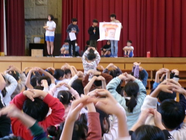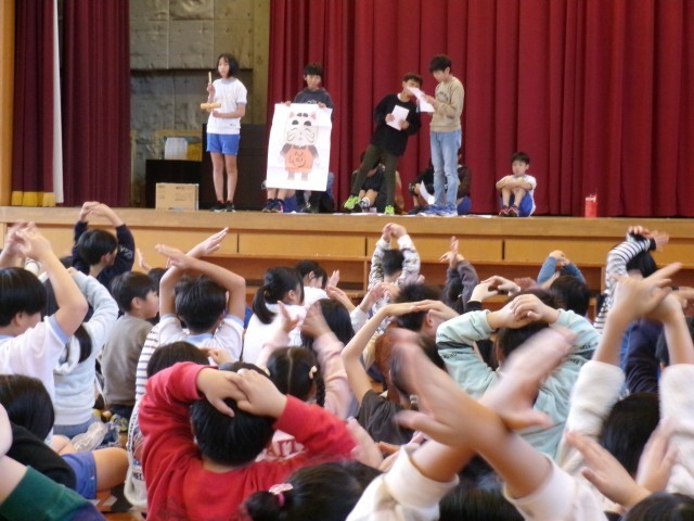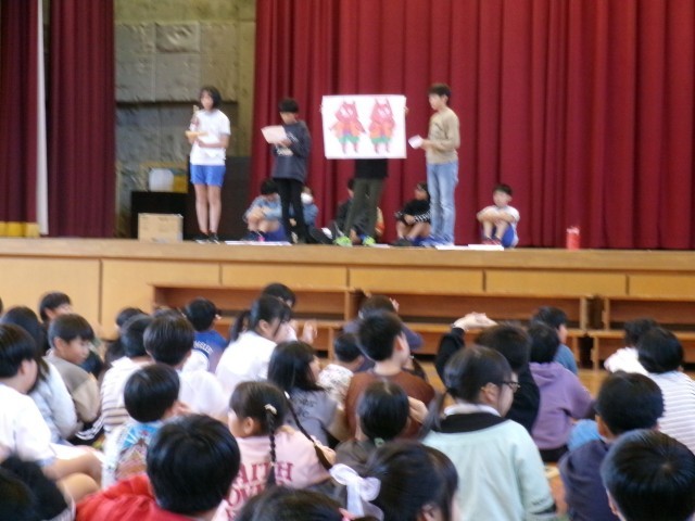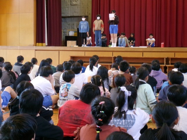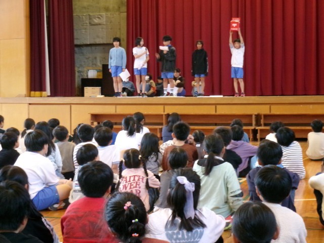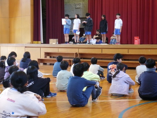 13時25分。全校児童が縦割り班の「ふたば班」で体育館に集合しました。司会の子どもの進行で児童集会がスタートしました。今日は11月10日から始まった「読書旬間」の取組について図書委員会の5・6年生が発表してくれました。期間は11月21日まで。この期間中は本の貸し出しは1回につき2冊まで。そして「読書郵便」と「読書ビンゴ」をしてくれます。さらに、新しい本の紹介や本にまつわるクイズも出題してくれました。今日に至るまでたくさん発表練習をしたんだろうなと思うくらい図書委員会チームとして上手な発表でした。「読書の秋」です。本の世界にたくさんの子どもたちが浸り、「豊かな想像力」を育んでほしいと思います。