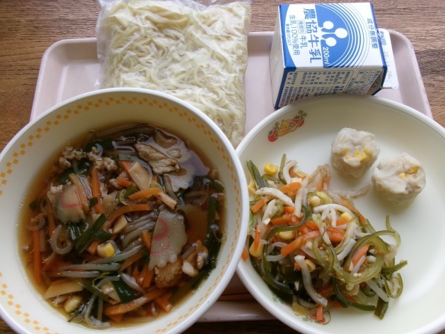 今日の献立は「ゆで中華麺」「醤油ラーメンスープ」「コーンしゅうまい」「茎ワカメのサラダ」「牛乳」です。ラーメンは、醤油ベースのスープに黄色い縮れ麺がよく絡みます。具材のもやし、なると、メンマ、ニラ、豚肉がスープにも麺にもよく合います。にんにくとしょうがも入っていますが、醤油味の後ろに隠れて、土台となる旨みを感じさせます。しゅうまいは柔らかくてコーンの黄色がとてもきれいです。サラダはすべての食材(茎ワカメ、もやし、にんじん、かまぼこ、キャベツ)が細長く千切りされているので、とても食べやすいです。さっぱりした塩味で、ほのかに甘みも感じられておいしいです。