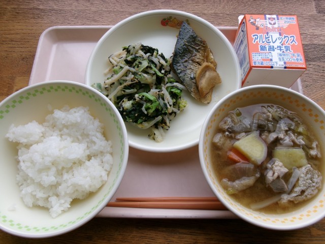 今日の献立は「ご飯」「鯖のカレー煮」「海苔酢和え」「さつま汁」「牛乳」です。鯖はうっすらと黄色でコーティングされ、カレーの風味を感じます。生姜も一緒に煮ているので、生臭さは完全に消えていて食べやすいです。海苔酢和えは醤油ベースの味付けで、のり、きゃべつ、もやし、かまぼこ、ごまを混ぜて酢で酸味を加えて和えてあります。塩味も穏やかでさっぱりとしているのでとても美味しいです。さつま汁は、さつまいもの甘さと鶏肉とごぼうから出るおいしい出汁、それがしみ込んだ大根と油揚げが最高です。