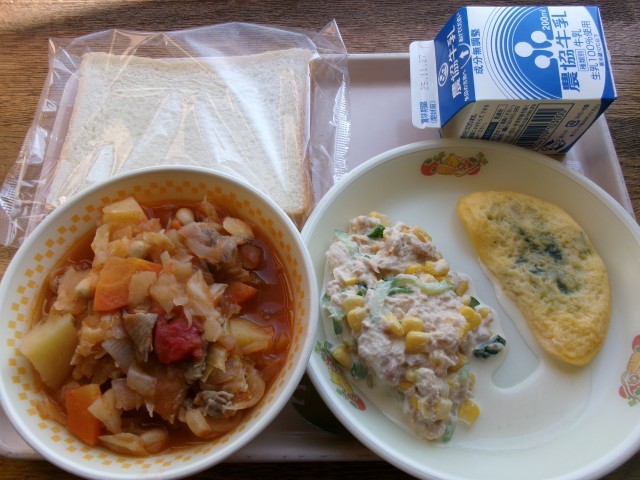 今日の献立は「食パン」「ツナマヨコーン」「ほうれんそうオムレツ」「ボルシチ風スープ」「牛乳」です。ツナとシャキシャキのきゅうりとコーンがマヨネーズで和えてあり、これを自分で食パンに挟んでいただきます。ほとんどの子どもたちは食パン2枚をぺろりと食べてしまいそうです。オムレツは濃い緑色のほうれんそうが入っていて、オムレツの中はしっとり柔らかく外はフワッとしておいしいです。スープはトマトの酸味が丁度良く、ほんのり甘さも感じられます。大きなじゃがいもと豚肉、キャベツと玉ねぎなどたくさんの野菜が入っています。献立を見るとセロリとにんにくも入っています。流行し始めたインフルエンザにかからないように全部食べてほしいです。