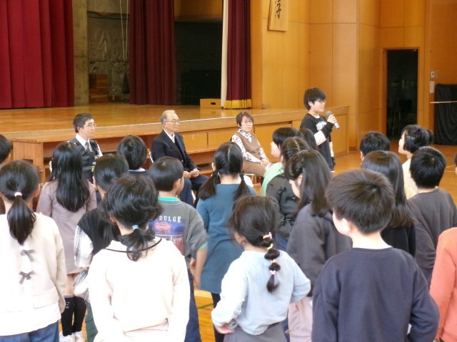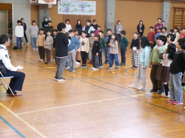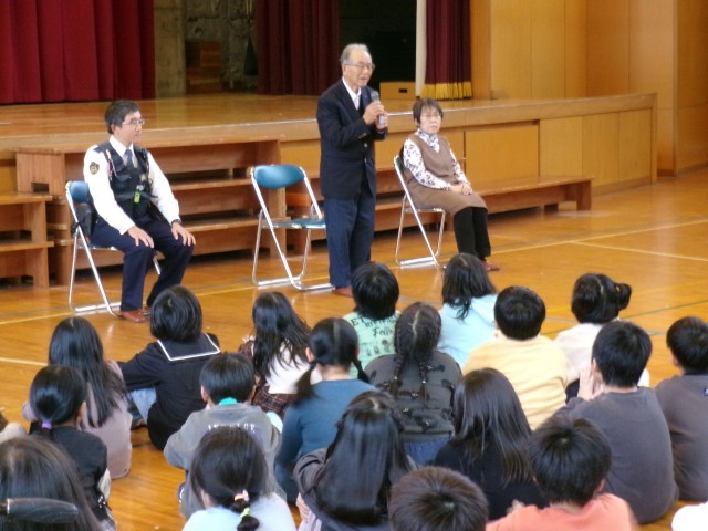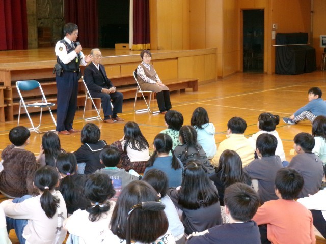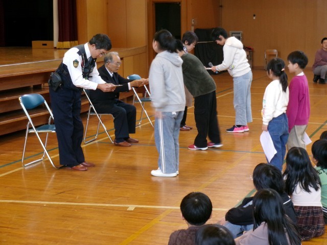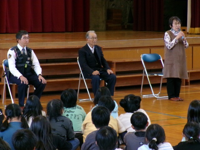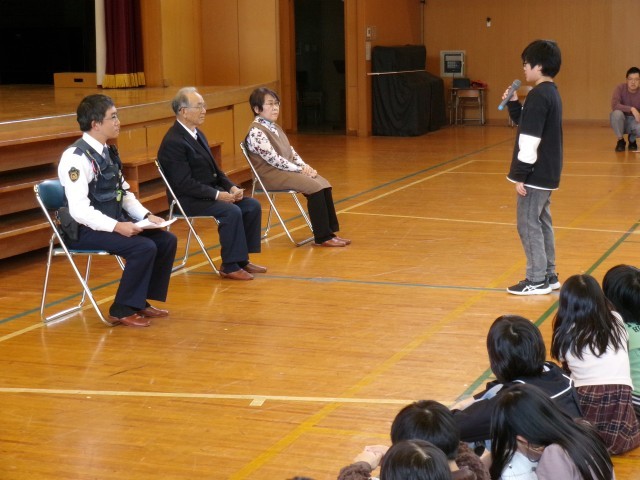 毎朝子どもたちの登校の様子を見守り、安全に学校に到着できるように立哨指導していただいているセーフティスタッフの皆様をお招きして「感謝の会」を開催しました。子どもたちからは学校で育てたアサガオの種をプレゼントし、全校で「南っ子交通安全宣言」を唱和しました。「私たち南っ子は、交通ルールを守り、自分の命と他の人の命を守ることを誓います」。最後に、セーフティスタッフを代表して、駐在所の大橋様からお話をいただきました。「子どもたちが元気でいる姿が一番のプレゼントです」「日没が早くなりました。反射材を付けて相手に見えるようにしましょう」「横断歩道が青信号でも突進してくる車はいるので十分気を付けましょう」「あなたの命はあなただけの命ではありません。大勢の人を悲しませないように」。子どもたちは真剣な表情で聴いていました。本日ご都合が合わず欠席されたセーフティスタッフの皆様、いつもありがとうございます。今後ともよろしくお願いいたします。これから季節は本格的な冬に向かいます。学校でも冬道の安全な歩行の仕方を指導しますので、保護者の皆様もお子さんの行動範囲や発達段階に合わせた指導をお願いいたします。