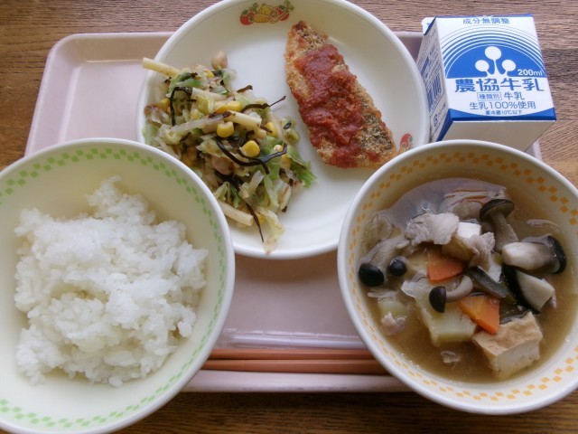 今日の献立は「ご飯」「アジフライ甘酒ソースかけ」「和風マカロニサラダ」「県産きのこ豚汁」「牛乳」です。アジフライは中が柔らかく、外はカリッとして、そこに味噌と甘酒(もちろんアルコールなし)を溶いたようなオレンジ色のソースがかかっています。ちょっと酸味も感じるような複雑な味です。サラダは刻んだ昆布とかつお節が入っていて、キャベツとマカロニを醤油ベースのタレで和えてあり、ご飯がすすみます。豚汁は表面を豚肉と厚揚げのおいしい脂が覆っているので、いつまでもアツアツです。味噌にたくさんの野菜の出汁が組み合わさり、大きなしめじとじゃがいも、玉ねぎとごぼうも入っていてとてもおいしいです。
