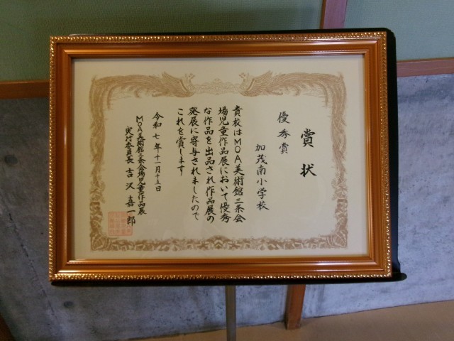 全国的にインフルエンザが猛威を振るう中、南小もこれ以上感染拡大させないようにと、子どもたち自身が写真のようなメッセージを発信してくれています。また、MOA美術展にたくさん絵画を出品し、多くの子が受賞したので、写真のような「学校賞」をいただきました。児童玄関に飾りましたのでお立ち寄りの際にご覧ください。