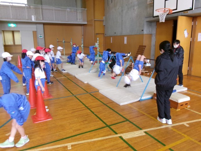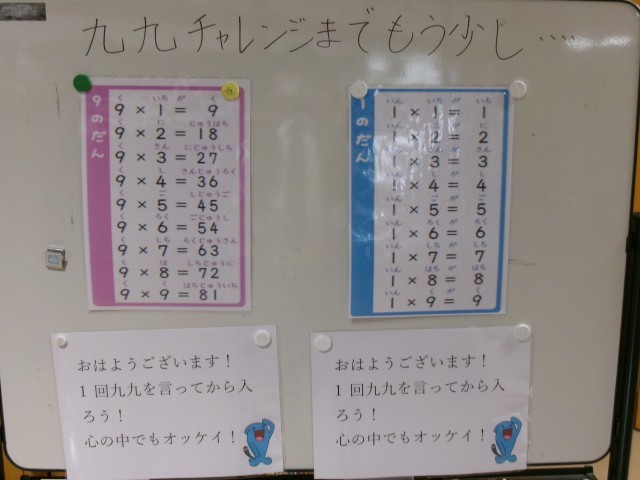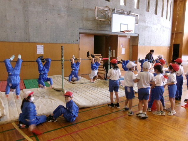 2年生は学年閉鎖が開けて、久しぶりにクラスメイトに会いました。教室の入り口には「九九」表が掲示され、これを唱えてから入室します。3時間目は体育の「鉄棒」でした。ぶら下がる技である「コウモリ」を練習していました。この後、鉄棒の「テスト」をするそうです。技は「つばめ」「前回り降り」「逆上がり」のようです。チャレンジは1回だけじゃないので、粘り強くトライしてほしいです。