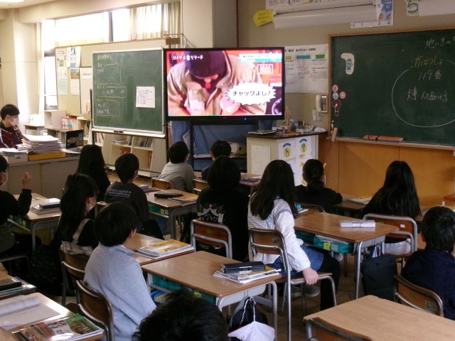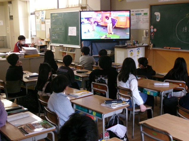 3年生は社会科で「消防署で働く人達」の学習をしています。部屋を暗くしてテレビを見ていました。実際に消防車見学をしたので予備知識があります。それと比較し、いいリアクションをとりながら映像を見ています。消防署の人が消防服に着替えるのに53秒、出演しているタレントさんは2分以上かかりました。日頃の訓練が大事ですね。