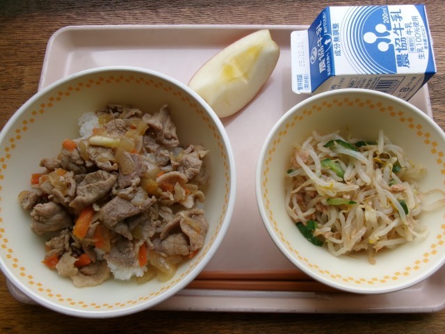 今日の献立は「ご飯」「豚生姜焼き丼の具」「もやしとツナのサラダ」「りんご」「牛乳」です。生姜焼き丼は、たくさんの豚肉と玉ねぎが生姜風味の醤油ダレで炒めてあり、このタレがご飯によくしみ込んでいます。サラダはもやしときゅうりのシャキシャキ食感が楽しめます。ツナも加わり、タンパク質も取ることができます。りんごは酸味がなく、さっぱりした甘さを味わえます。