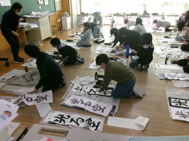 3時間目、4年生は「書き初め」練習をしていました。手本文字は「光る空」です。例年、手本文字に平仮名「の」が入るのですが、今回は「る」です。丸めるところの筆遣いが難しく、かすれやすいのですが・・・子どもたちはたっぷり墨をつけて書いているようです。手本をよく見て、大きく太く書いて欲しいです。