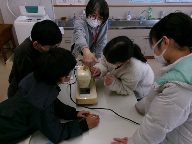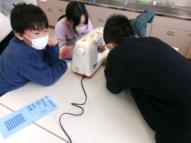 3時間目、5年生は家庭科で「ミシン縫い」の学習をしています。今日は「上糸」のセット方法を学んでいました。担任がミシン針に糸を通すところまでを実演し、子どもたちはそれを注意深く見て学んでいます。その後は班に分かれて実際にやってみました。ミシンは縫う前の準備操作が難しくて嫌になってしまう子がいるのですが・・・。南小の5年生は粘り強く頑張っています。