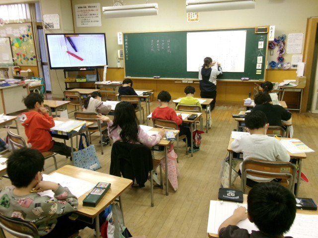 1年生は国語「思い出して書こう」の学習です。自分が鉄棒遊びをする様子などを思い出して、作文メモに「やったこと」「思ったこと」などを書き溜めます。これを時系列にして「始めに」「次に」「それから」「最後に」と接続詞をつけて作文にします。それを「原稿用紙」に書いていきました。初めての「原稿用紙」です。題名の書き方や氏名の書き方、段落の付け方など基本的なことをどんどん吸収していきます。