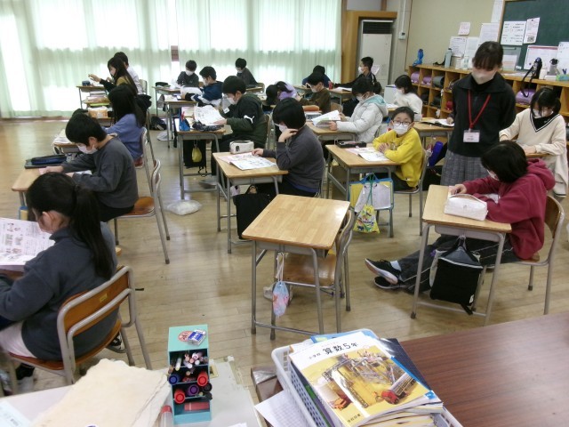 5年生は保健体育「心の健康」の学習です。日常生活において、自分の心の発達や成長について意識することはほとんどないと思います。5年生は教科書の子ども同士のトラブルが描かれた挿絵を見て「これはどういうシチュエーションで、どう対応すればいいと思うか」自分の考えを一生懸命書き記しています。話し合いの場面では「それは男女差別だよ」「平等に考えないと・・・」など発言に対するリアクションが飛び交います。幼い頃は自己中心的だったのが、全体を見て考えられるようになってきた、これを「心の成長」というんだなと理解できたようです。