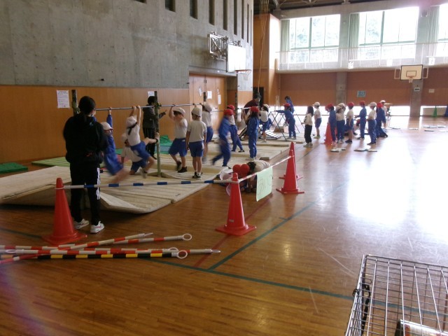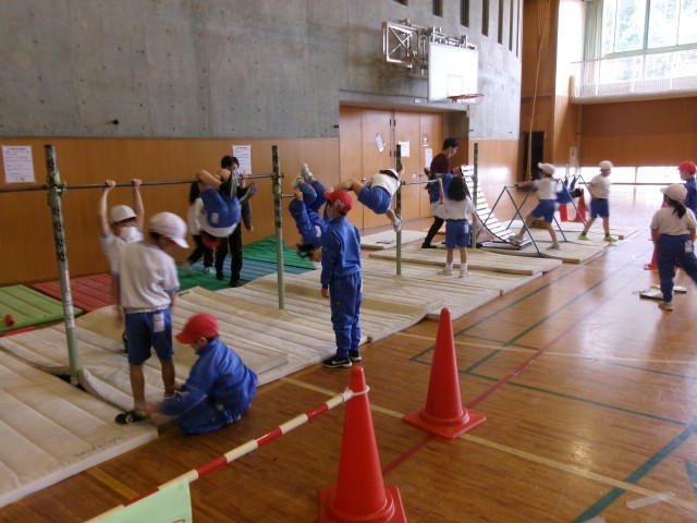 2年生が体育館で「鉄棒」をしています。小さいものから大きいものまで、すべての鉄棒に子どもたちがぶら下がっているのを見ました。「布団干し」「ぶたの丸焼き」「こうもり」等をする子がたくさんいたので遠くから見ると圧巻でした。そして次にやる子達が列を作って並んでいるのが素晴らしいと思いました。