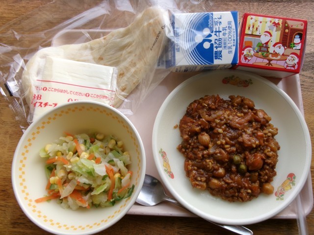 今日の献立は「米粉ナン」「ひよこ豆のドライカレー」「コールスローサラダ」「スライスチーズ」「お楽しみデザート」「牛乳」です。ナンは柔らかくてモチモチしています。ドライカレーは余分な水分が抜けてナンに盛り付けやすいです。ウインナーも入り、にんにくと生姜が効いて濃厚なカレーです。サラダはうっすら酸味があり、キャベツの甘味が感じられます。お楽しみデザートはチョコケーキでした。小さい子どもたちは、この箱を持ち帰りたいと言うでしょう。
