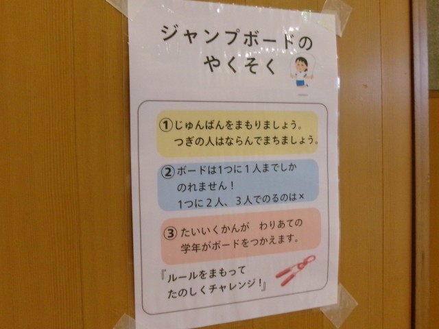 続けて「ジャンプボード」の使い方の説明と確認です。寒い冬の運動として「なわ跳び」は最適です。「短なわ」でいろんな跳び方に挑戦し「できた」喜びを味わうとともに「やればできる」という自己肯定感を高めることもできます。また、「長なわ」があれば、何人か集まって跳び続ける楽しさを共有できます。1月は「なわ跳び強調月間」です。ジャンプボードを上手に仲よく使って、「二重跳び系の技」「三重跳び」などにも挑戦して欲しいです。