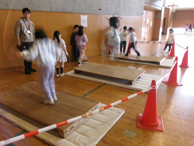 昼休みに2年生の子どもたちが「ジャンプボード」を使って縄跳びの練習をしています。板の反動で高くジャンプできるので、なわを跳びやすくなります。少しずつ「二重跳び」ができる子も現れてきたそうです。この調子で頑張り続けると「できた」と喜ぶ顔がたくさん見れそうです。