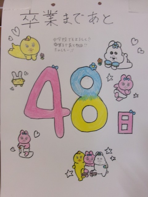 6年生はいよいよ「卒業カレンダー」が掲示されました。卒業まであと50日、49日、48日・・・・。作成した担当の子どもから一言メッセージが書かれています。これを読むのも楽しいです。
