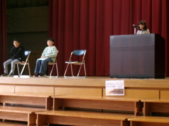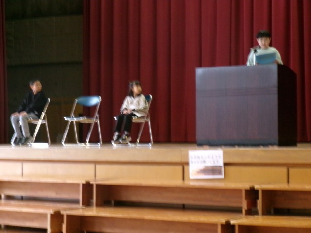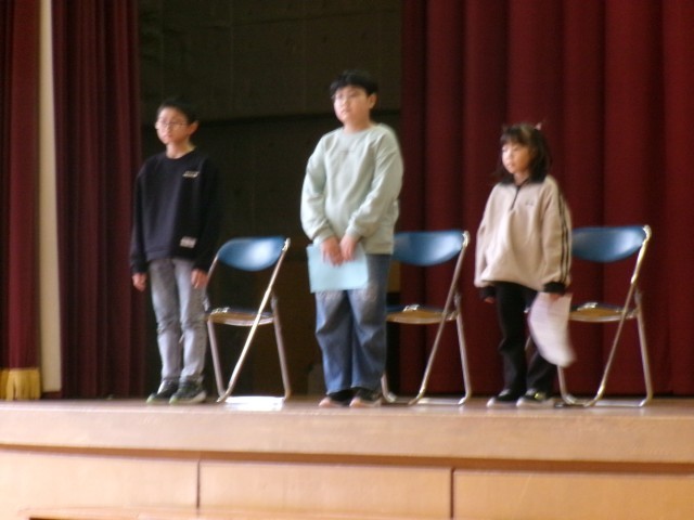 お昼に全校集会を行いました。1・3・5年生の代表児童による3学期のめあて発表です。1年生は「画数の多い漢字が出てくるので練習を頑張る」「跳び箱をする時に人に支えてもらわないで自分で跳べるようになる」「素敵な2年生になりたい」。3年生は「冬休みの書き初め練習で金賞がとれるように頑張った。3学期の習字も頑張る」「算数の文章題。数が大きくなるかけ算が難しい。自学で苦手をなくすように努力したい」。5年生は「授業を頑張る。1つ目は算数。直方体や立方体の体積のように難しい問題が多くなるから。2つ目は体育。なわ跳びの二重跳びをたくさん跳べるようになりたい」「六年生を送る会がある。今までお世話になった6年生に感謝の気持ちが伝わるように頑張りたい」。3人は具体的な目標を立てて、堂々と発表してくれました。格好良かったです。