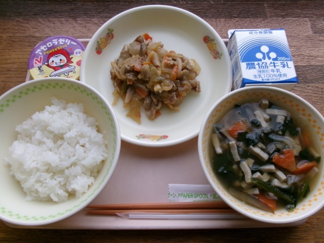今日の献立は「ご飯」「豚肉と舞茸の生姜炒め」「かわりけんちん汁」「アセロラゼリー」「牛乳」です。炒め物は、大きな豚肉と舞茸と玉ねぎ、対照的に小さなパプリカ、こんにゃく、タケノコの組み合わせです。中華丼の味付けで、ご飯がすすむと思います。けんちん汁は凍り豆腐が入っています。鶏肉と根野菜から出汁がよくでています。ゼリーはきれいなオレンジ色でほんのり甘くて、アセロラの風味を感じました。