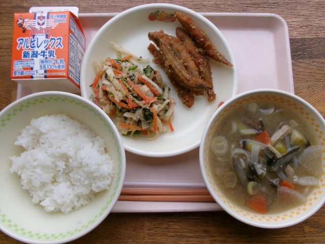 今日の献立は「ご飯」「きびなごの南蛮漬け」「切り干し大根のごま酢和え」「さつま汁」「牛乳」です。きびなごはEPAとDHAを豊富に含んだ栄養満点の食材だそうです。血液の流れがよくなり、学習記憶力も高まるそうです。中は柔らかく、外はカリッと揚がっています。ちょっと苦みがありますが、カルシウムも豊富なので食べて欲しいです。和え物は切り干し大根のザクザク食感とごま酢の酸味の組み合わせを楽しんで欲しいです。さつま汁は、ごぼう、鶏肉、長ネギの出汁がスープによく出ていて、ホクホクのさつまいもの甘味も感じられるお汁になっています。