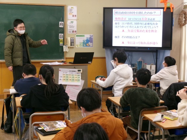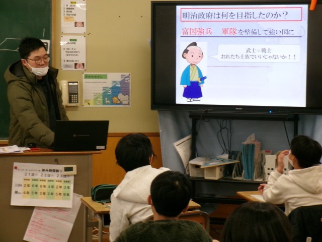 4時間目、6年生が社会の歴史の学習をしています。内容は明治時代になり、日本の様子が大きく変わる場面です。黒板には「地租改正」「富国強兵」「徴兵令」などの言葉が並んでいます。「当時の10円は今の20万円くらいの価値があるぞ」「どうして女性には兵役がないんですか」などいろんな質問やつぶやきが聞こえてきます。江戸時代との違いは何か、明治政府はどんな国づくりを目指したのかを考え、しっかりノートに記録しながら学んでいました。