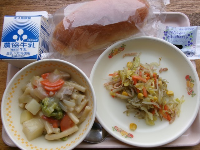今日の献立は「米粉パン」「ブルーベリージャム」「もやしのカレーソテー」「マカロニグラタン風」「牛乳」です。米粉パンはもちもちした食感で、ブルーベリージャムは甘さ控えめです。ソテーはカレーの風味がしっかり付いています。グラタン風はマカロニと同じように、鶏肉とじゃがいも、玉ねぎ、ブロッコリーもとても柔らかくてトロッとしています。お替わりの行列ができそうです。
