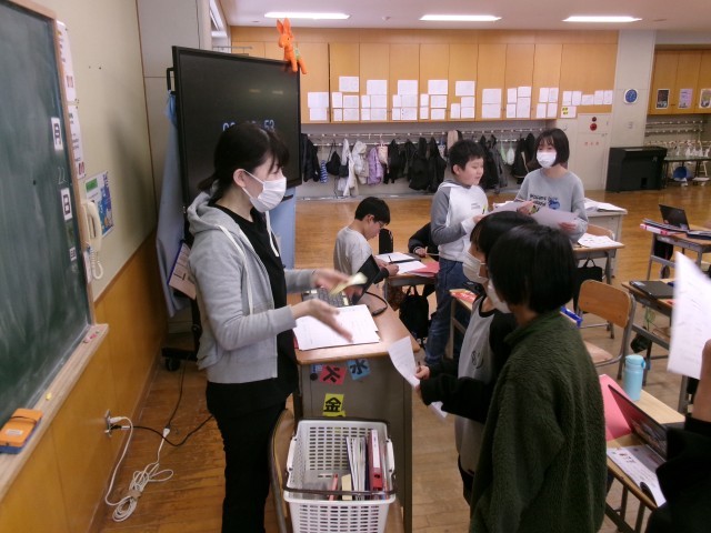 6年生は外国語の授業です。英語で「なりたい職業を尋ね合う」やりとりができるのが目標です。「次、私とやろう」と声を掛け、次々に相手を変えて練習していました。外国語専科やALTの先生とも積極的に会話しています。これらのやりとりが、子どもたちのコミュニケーション能力を育み、学級力も高まっていきます。