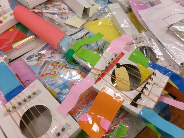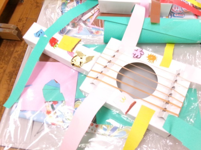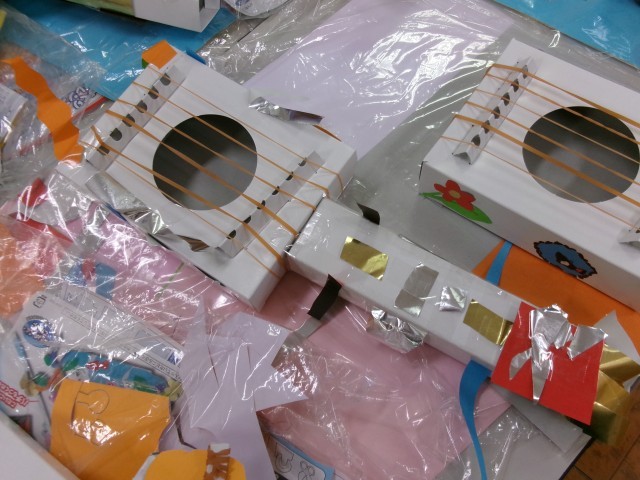 2年教室前に、未完成ですが「音づくりフレンズ」という教材で作った「ギター」が置いてありました。厚紙?ボール紙?でできていてとても丈夫です。外側は折り紙や色画用紙などで装飾されつつあります。糸の代わりにゴムが張られています。子どもが持つとウクレレのような感じになりそうです。一体どんな音色がするのでしょう。