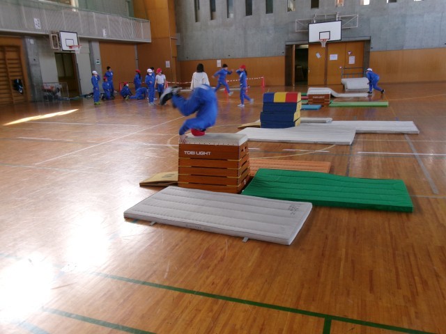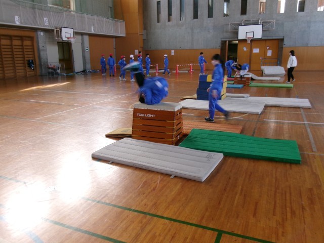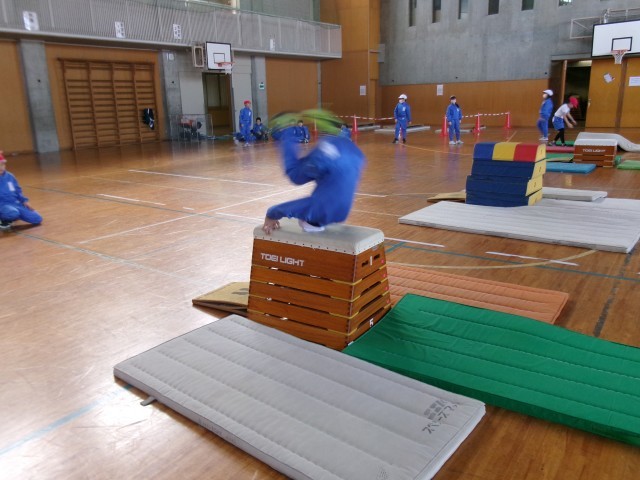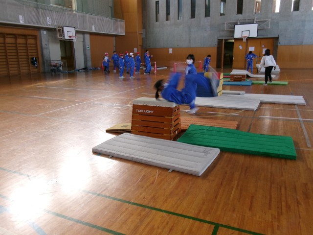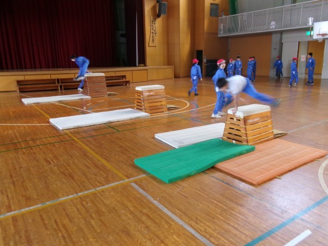 5年生が体育で「跳び箱運動」をしていました。跳んだ人が、ずれてしまったマットや踏み切り板を直してから、後ろの人に「跳んでいいよ」と合図を出しています。いろんな跳び方がありますが、そのコツを思い出し、全員で確認し、自分の体に合う跳び箱を選んで挑戦しています。今日は「開脚跳び」と「台上前転」です。「台上前転」は今後、いろんな発展技につながっていく基本となる跳び方です。みんなにマスターしてほしいです。