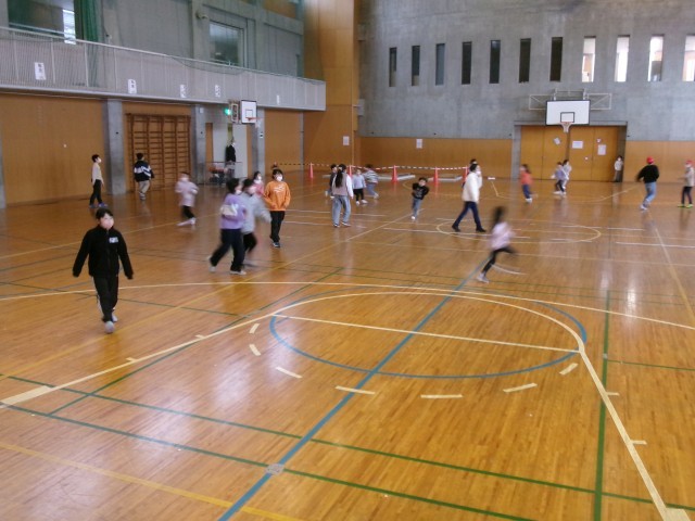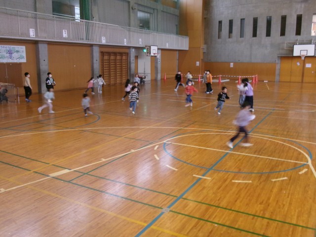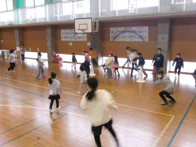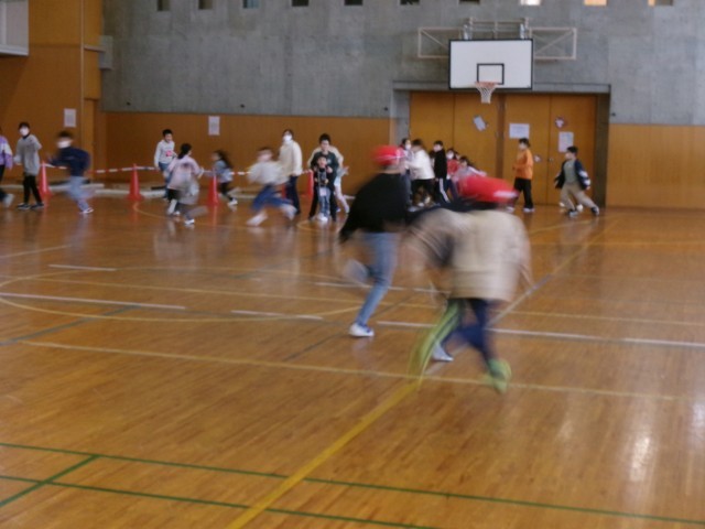 今度は5年生が登場です。来年入学する1年生にとって、最上級生になる現5年生がお世話をします。就学時健診の時は、各種検査会場に連れて行き、時間が空くと絵本を読んであげたり、トイレに連れて行ったりした5年生です。今回は広い体育館で思いっきり走り回ってもらおうと、鬼ごっこを計画しました。5年生の赤帽子の子が鬼になり、全力で追いかけます。新1年生も全力で逃げ回りました。途中で「先生も鬼に加わりま~す」と言って担任も追いかけます。疲れた子がステージのひな壇に腰掛けて「無理だよ~」と笑顔でつぶやいていたのが印象的でした。さて年長の皆さんは喜んでくれたでしょうか。1年生も5年生も本当にお疲れ様でした。
