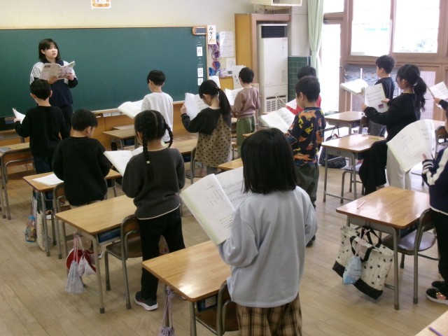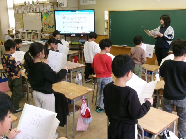 1年教室から「息をいっぱい吸って~」という声が聞こえてきました。「♪君が代」の練習です。3月24日は卒業式。お世話になった6年生のお兄さん・お姉さんのために、一生懸命練習していました。