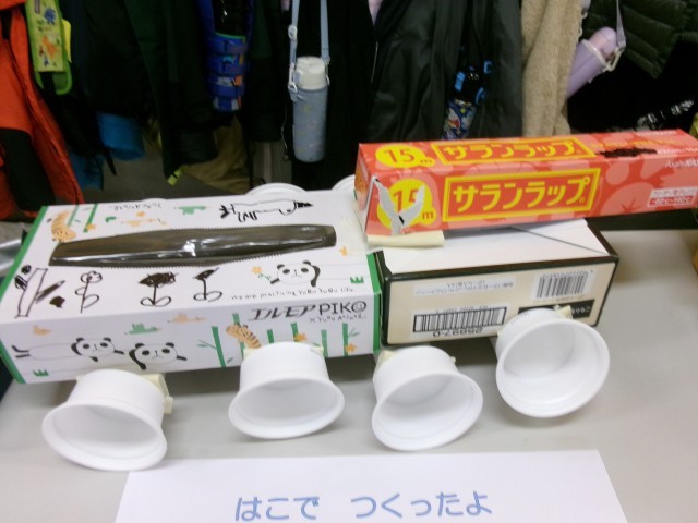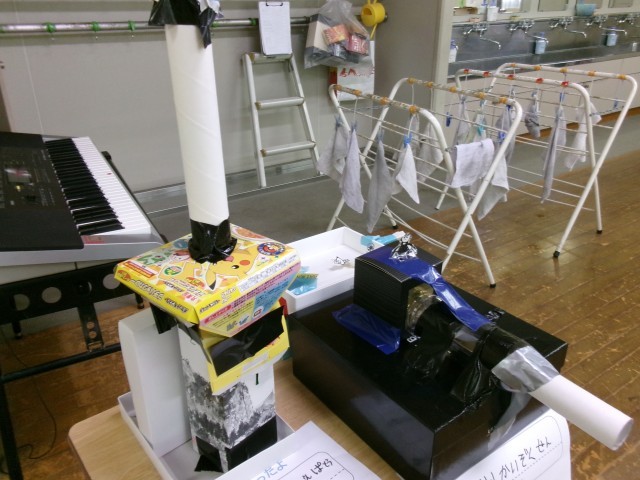 1年生が工作の作品を展示していました。単元名は「はこでつくったよ」です。作品名は「●●なかいぞくせん」「さいきょうの●●きかんしゃ」など、迫力があります。お家の方に、空き箱を準備していただいたおかげでできあがった作品だと思います。本当にありがとうございました。