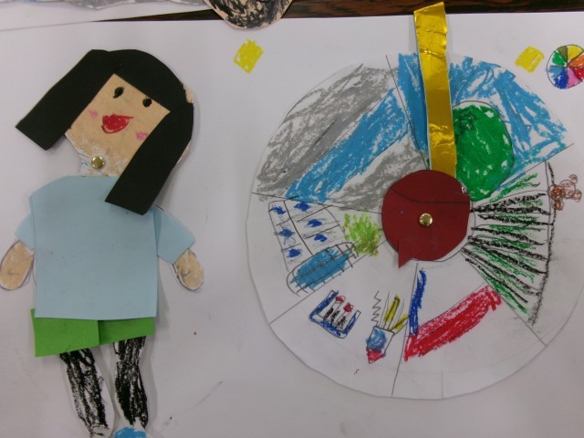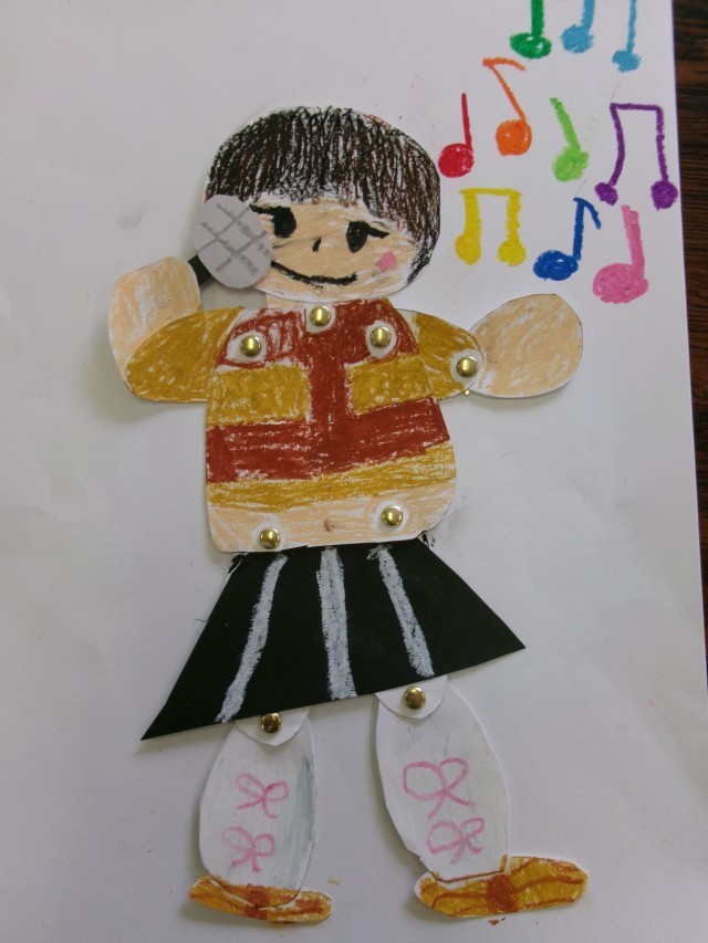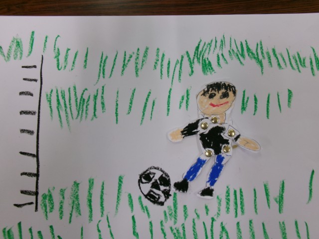 3年教室隣りの学習室に、図工の作品が飾られています。単元名は「動いて楽しい割りピンワールド」です。これまで作ってきた作品と異なり、割りピンで留めることで可動部位ができます。もし人間の関節部分を割りピンで留めれば、ポーズを自由自在に変えられます。工作に対する子どもたちの見方・考え方が変わりますね。