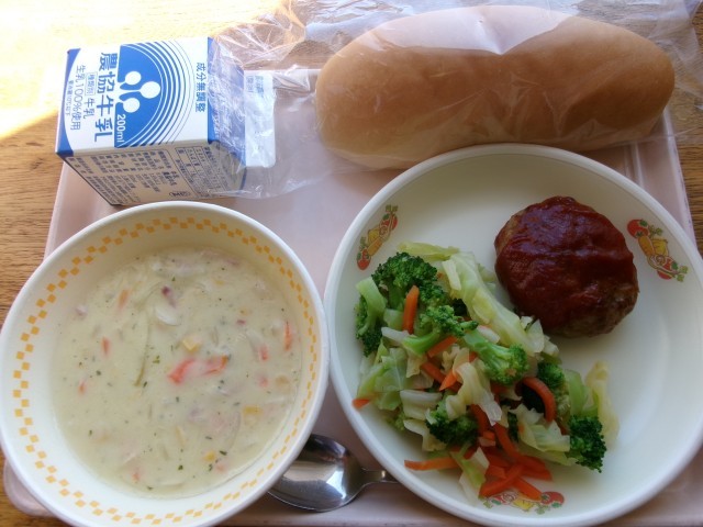 今日の献立は「コッペパン」「チーズハンバーグのケチャップソース」「ゆで添え野菜」「コーンポタージュ」「牛乳」です。コッペパンは柔らかくて小麦の香りがします。ハンバーグの中のチーズがトロトロでした。ケチャップソースは甘酸っぱくてハンバーグによく合います。添え野菜はブロッコリーとにんじんの色が鮮やかです。堅さも丁度良く、うすい塩味が感じられます。コーンポタージュは玉ねぎやにんじんが千切りされて子どもたちは食べやすいと思います。とろみがあって冷めにくいです。