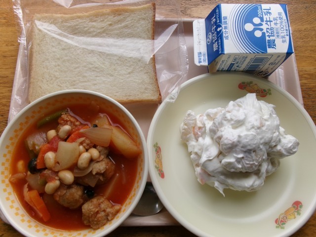 今日の献立は「食パン」「フルーツクリーム和え」「ミートボールのトマト煮」「牛乳」です。子どもたちに大人気のフルーツクリームサンドです。食パンに挟むクリームの量を自分で調節できるのがいいですね。わざとお皿に残して、これだけで食べる子もいるかもしれません。生クリームは甘さ控え目で、缶詰フルーツの甘さが引き立ちます。トマト煮は、じゃがいも、玉ねぎ、にんじん、さやいんげん、しめじが、アツアツで酸味のあるトマトスープで柔らかく煮込まれています。