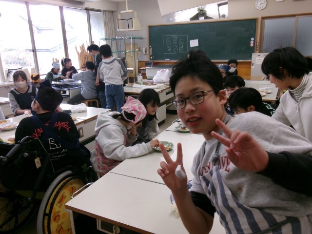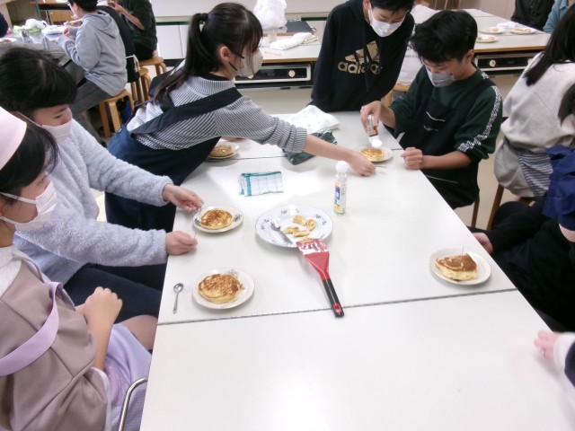 6年生が総合学習で「卒業プロジェクト」に取り組んでいます。小学校生活の思い出作りや、在校生に向けた最後の奉仕活動の企画・準備作業など、卒業を控え、忙しい毎日を過ごしています。今日は、6年生がホットケーキを作っていました。家庭科室からもれたいい香りが全学年教室に流れていきます。「いいにおいがする」「今日、お姉ちゃんがホットケーキを作るって言ってた」「いいなあ」といった会話が聞こえてきました。