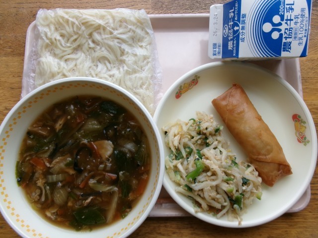 今日の献立は「ゆで中華麺」「五目うま煮麺の汁」「春巻き」「切り干し大根の中華和え」「牛乳」です。五目うま煮麺は、醤油ベースでとろみのあるスープです。白菜、チンゲンサイ、イカ、アサリ、しいたけ、キクラゲなどたくさんの具材が入っています。春巻きは、皮がパリッとしています。和え物の味付けは、スープよりもあっさりしていて、きゅうり、もやし、鶏肉、ごまといった具材の味がよく分かりました。今年度の給食は明日の1食のみです。お楽しみに。