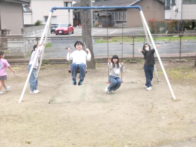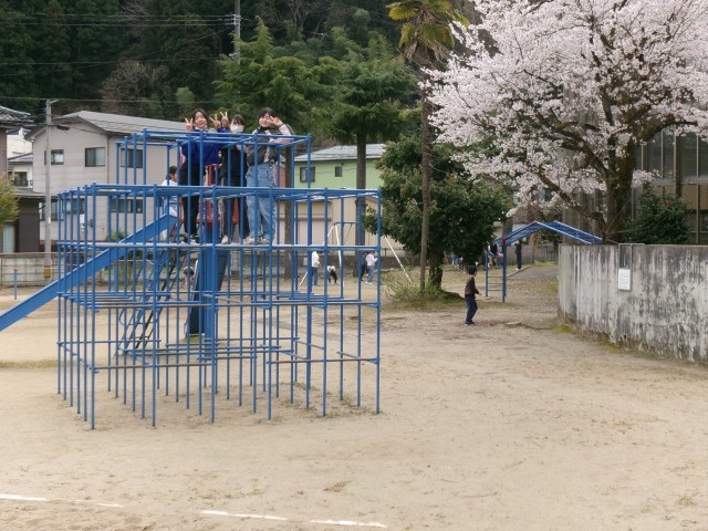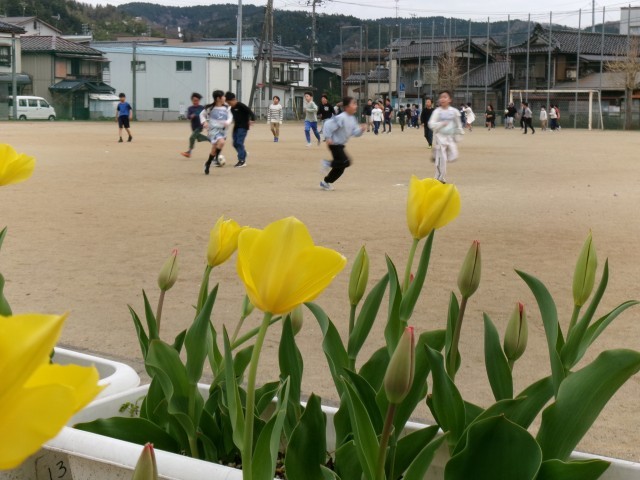 給食でフルーツサンドを食べた後は、令和8年度最初の昼休みです。今日は「清掃」はありません。ほとんどの子どもたちがグラウンドに出て遊んでいます。鬼ごっこ、サッカー、ジャングルジム、ブランコ、シーソーなどを楽しんでいます。校地内の桜や椿、チューリップも子どもたちを見守っています。子どもたちは、遊びを通して、共通のルールを作ったり、それをしっかり守ったりして、公正、公平の大切さや人間関係づくりを学びます。遊びは大切な学びのチャンスです。