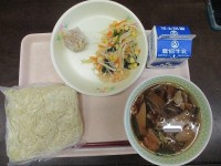 今日の献立は、肉みそかけうどん、茎わかめのサラダ、ぶどう、牛乳でした。肉みそか...