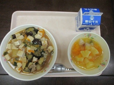 今日から給食が再開しました。今日の献立は、マーボー夏ベジ丼、オレンジサワーポンチ、牛乳でした。マーボー夏ベジ丼は、なすやとうがんなどの夏野菜の味をたっぷりと味わうことができました。オレンジサワーポンチも子どもたちに大人気でした。