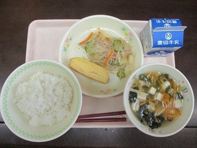今日の献立は、ごはん、厚焼き玉子、春雨の中華サラダ、なめこの中華スープ、牛乳でした。厚焼き玉子は程よい甘みで、ふんわりと柔らかかったです。春雨の中華サラダも味がよく付いていて、おいしかたです。
